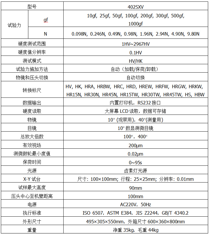 402SXV數(shù)顯顯微維氏硬度計是光、機、電一體化的高新技術產(chǎn)品,它造型新穎、美觀,內(nèi)部結(jié)構多用不銹鋼零件組成,性能更佳。在大屏幕上能更加直觀地顯示試驗方法、試驗力、壓痕長度、保荷時間、測量次數(shù)、轉(zhuǎn)換標尺、日期時間,操作時只要測量壓痕按目鏡按鈕,即可自動計算出硬度值并顯示在屏幕上。具有上下限報警功能,數(shù)據(jù)結(jié)果可以保存通過表格查看,也可通過內(nèi)置打印機輸出,并配有RS232接口供用戶連接電腦輸出?蛇x配努氏壓頭進行努氏硬度測量,也可選配LCD視屏測量裝置和CCD圖像自動測量系統(tǒng)。