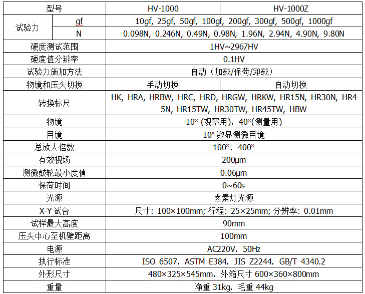 HV-1000 / HV-1000Z數(shù)顯顯微維氏硬度計(jì),在機(jī)械、光學(xué)、光源上采用獨(dú)特精密設(shè)計(jì),使壓痕成像更清晰,測(cè)量更精確。配備數(shù)顯測(cè)微目鏡,不用查表,也不用輸入壓痕對(duì)角線,在屏幕上能顯示試驗(yàn)方法、試驗(yàn)力、壓痕長(zhǎng)度、保荷時(shí)間、測(cè)量次數(shù)、轉(zhuǎn)換標(biāo)尺,操作時(shí)只要測(cè)量壓痕按目鏡按鈕,即可自動(dòng)計(jì)算出硬度值并顯示在屏幕上?蛇x配努氏壓頭進(jìn)行努氏硬度測(cè)量,也可選配LCD視屏測(cè)量裝置和CCD圖像自動(dòng)測(cè)量系統(tǒng)。