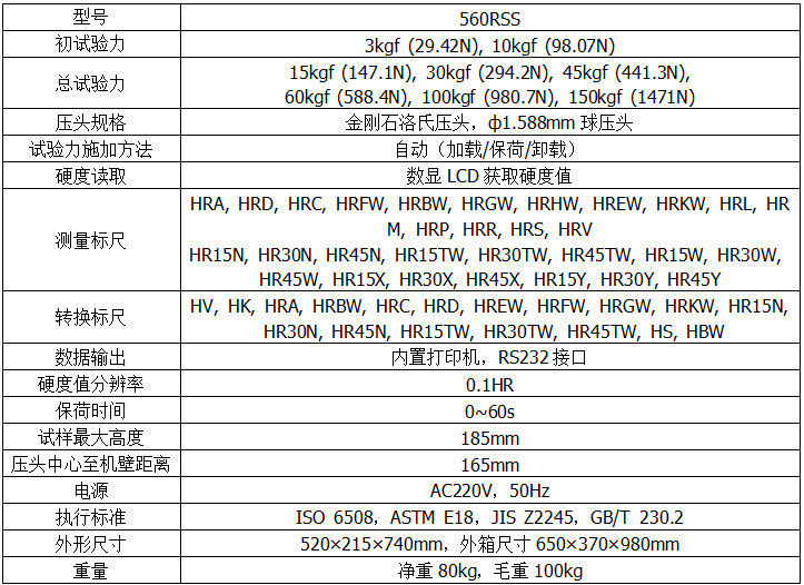 560RSS數(shù)顯雙洛氏硬度計(jì)外形新穎、功能齊全、操作方便、顯示清晰直觀、性能穩(wěn)定,是集機(jī)電于一體的高新技術(shù)產(chǎn)品,可進(jìn)行洛氏、表面洛氏全部標(biāo)尺的硬度測(cè)試?娠@示和設(shè)置當(dāng)前測(cè)試標(biāo)尺、試驗(yàn)力、測(cè)試壓頭、保荷時(shí)間、硬度轉(zhuǎn)換值、壓頭類型等,其主要功能如下:洛氏、表面洛氏硬度標(biāo)尺的選擇;各硬度標(biāo)尺之間的換算值;硬度測(cè)試結(jié)果可保存查看及打印輸出,自動(dòng)計(jì)算最大、最小、平均值;配有RS232接口供用戶連接電腦輸出。