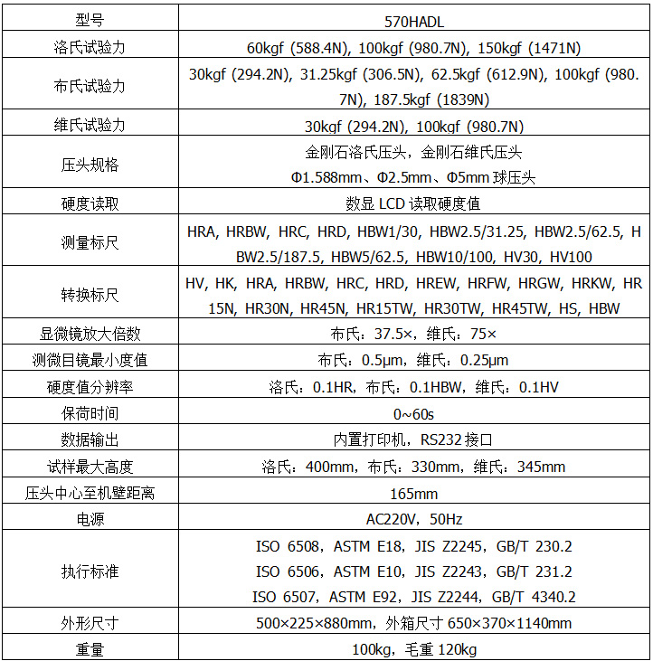 570HADL數(shù)顯布洛維硬度計外形新穎、功能齊全、操作方便、顯示清晰直觀、性能穩(wěn)定,是集光機電于一體的高新技術(shù)產(chǎn)品,可進行布氏、洛氏、維氏三種試驗方法測試,具備了七級試驗力的多功能硬度計,能滿足多種硬度測試需求。手動加載初試驗力后,總試驗力的加荷、保荷、卸荷自動完成,操作簡便迅速?娠@示和設(shè)置當(dāng)前測試標(biāo)尺、試驗力、測試壓頭、保荷時間、硬度轉(zhuǎn)換值、壓頭類型等,其主要功能如下:布氏、洛氏、維氏硬度的三種試驗方法測試;各硬度標(biāo)尺之間的換算值;硬度測試結(jié)果可保存查看及打印輸出,自動計算最大、最小、平均值;配有RS232接口供用戶連接電腦輸出。本設(shè)備為加高型,使測量大物件更加方便。
