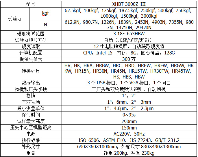 XHBT-3000Z III全自動(dòng)三壓頭數(shù)顯布氏硬度計(jì)殼體鑄造而成,剛性強(qiáng),測(cè)量精度高;采用精密結(jié)構(gòu)設(shè)計(jì),試驗(yàn)力施加由力傳感器直接控制,使整機(jī)結(jié)構(gòu)緊湊,加卸試驗(yàn)力平穩(wěn)、準(zhǔn)確。在電氣上由CPU控制試驗(yàn)過程,物鏡和壓頭間采用自動(dòng)切換,切換定位采用機(jī)械與電子雙重配合,使定位精度提高。內(nèi)置觸摸屏,微型電腦,使參數(shù)設(shè)定、結(jié)果顯示更加直觀,操作更加便捷,也避免了顯微鏡的光源給眼睛帶來的刺激和視覺疲勞,減少了測(cè)量誤差。選擇相應(yīng)的標(biāo)尺開始后,硬度計(jì)將自動(dòng)選擇壓頭及物鏡,平臺(tái)自動(dòng)上升,施加完試驗(yàn)力后自動(dòng)回到聚焦面,壓痕清晰顯示并自動(dòng)測(cè)量,實(shí)現(xiàn)了布氏測(cè)量的全自動(dòng)化。